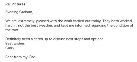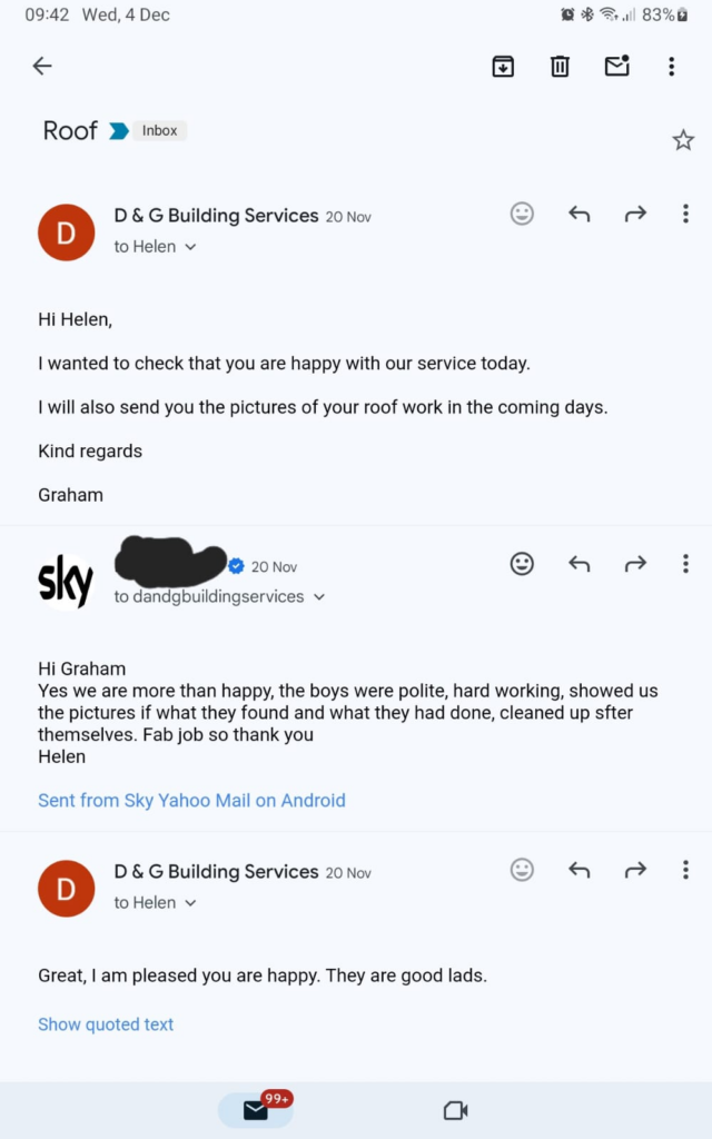 At the end of this maintenance a verbal recommendation will be given on the condition of the roof. This could include recommendations for additional work that may be required in the future or any urgent work required now. This will be backed up with pictures of the issue and the maintenance work undertaken.